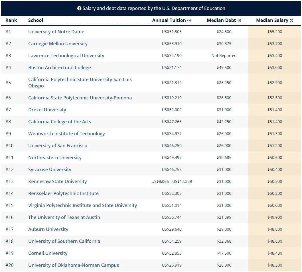 在建筑学专业排名靠前的学校中,这25所学校的起薪中位数在47,800-55,200美元之间。相比STEM专业,建筑学的起薪相对较低。