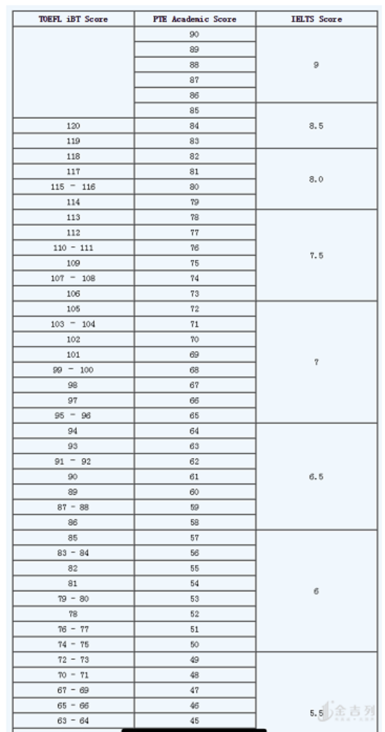 最后放张pte和雅思托福的分数对照图给大家,祝所有同学语言攻克成功!
