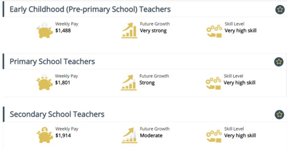 全澳洲中学的技术、科学及数学老师也已有严重短缺的情况出现,外国语言教师亦已出现不足的情况。这些状况尤其又因为近几年海外留学生人数在澳洲的剧增而变得日益严峻,部分教师的薪酬由三万八千元起始,几年后就提升至五至八万元以上。随着中国移民的涌入,部分中国移民比较多的州,要求增加中文授课的呼声越来越高,所以中文老师也存在着很大缺口,而教育专业一向被中国学生忽视,所以很多地区中文老师的就业率几乎达到100%。