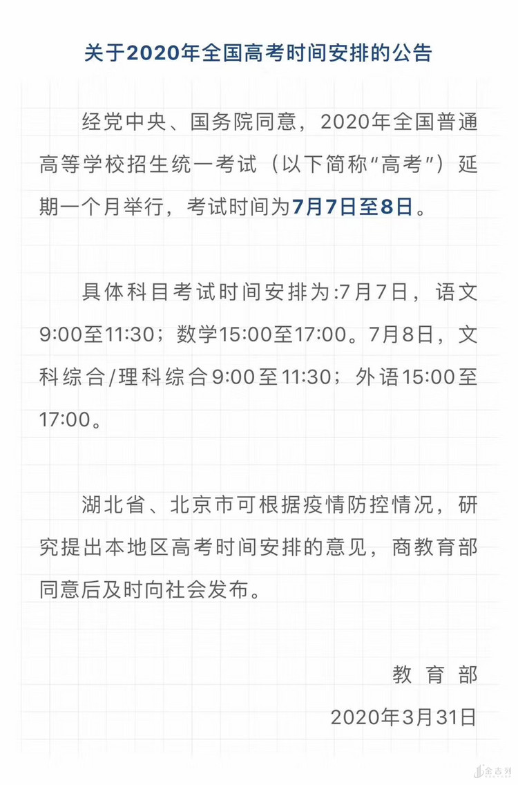 2020年全国普通高等学校招生统一考试(高考)延期一个月举行,考试时间为7月7日至8日。