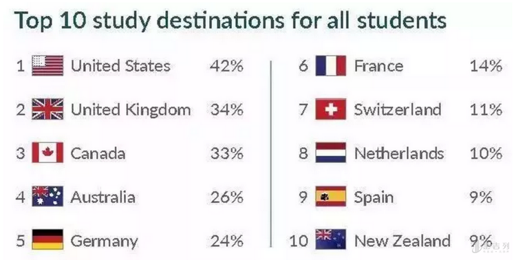 在 2018qs 留学报告中 , 关于 " 去哪里留学 " 这个问题 , 一直以来榜上有名的几个热门目的国家并没有变化。美国以 42% 的占比霸占最佳留学目的国第一名,其次是英国 ﹙34%﹚ 和加拿大 ﹙33%﹚ 、澳大利亚 ﹙26%﹚ 和德国 ﹙24%﹚ 紧随其后。
