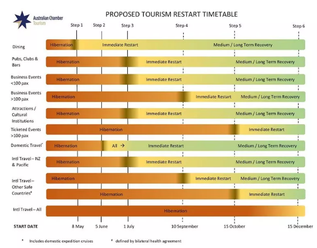 旅游业重启小组(Tourism Restart Taskforce)每周都会跟联邦政府就解封事宜进行商谈,讨论重开旅游业的计划。5月22日,小组与旅游部长Simon Birmingham的会议上,终于获批了国内旅游和活动,以及重开国际旅游的时间。