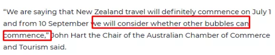 澳大利亚商会和旅游商会主席John Hart表示,澳洲肯定会在7月1日解除与新西兰的旅行限制,与此同时,政府也在考虑9月1日解封更多国家。