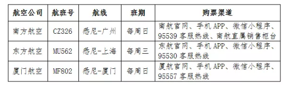 中国驻悉尼总领馆公布了6月中澳客运航班的运营情况。经向有关航空公司核实,6月自悉尼飞往中国相关城市客运航班及购票渠道信息如下: