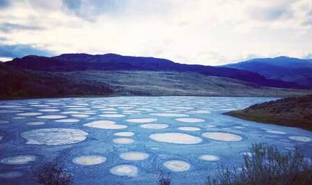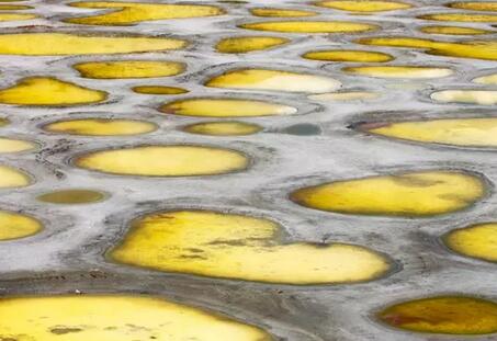 在 BC省欧垦娜根地区的奥索尤斯(Osoyoos)存在着加拿大唯一的一个小型沙漠,而神奇的斑点湖(Spotte Lake)就坐落在这里。每年夏天,高温会让湖水大量蒸发,湖底的矿物质逐渐裸露出来,形成很多镶着白边的界限与浅池。这些遍布在湖面上的圆形斑点会随着湖水的流动而变幻形状,一阵风吹来,像极了闪烁着的几百只眼睛。