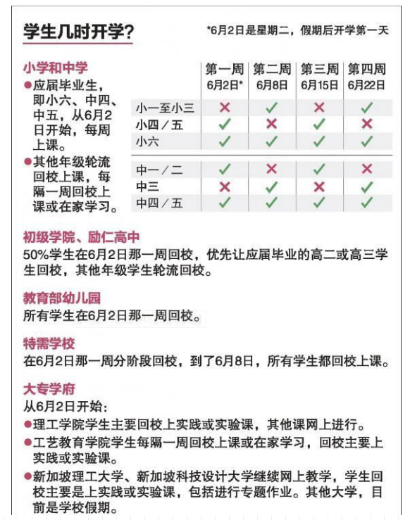 新加坡政府通知,新加坡学校将从6月2日起重开,但第一阶段只有小六、中四和中五毕业班学生恢复每日返校上课,其余年级则采取每周轮流返校制度。
