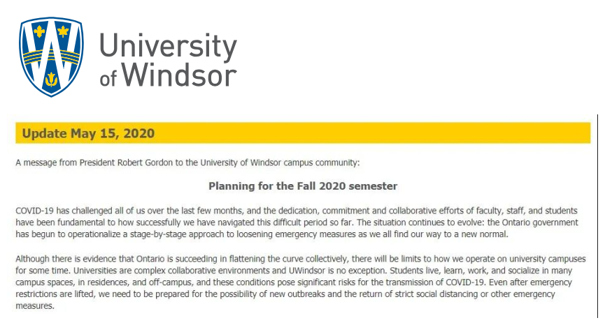 5月15日,温莎大学宣布将秋季学期的大部分课程转为网课教学。同时,期末考试也将线上进行。