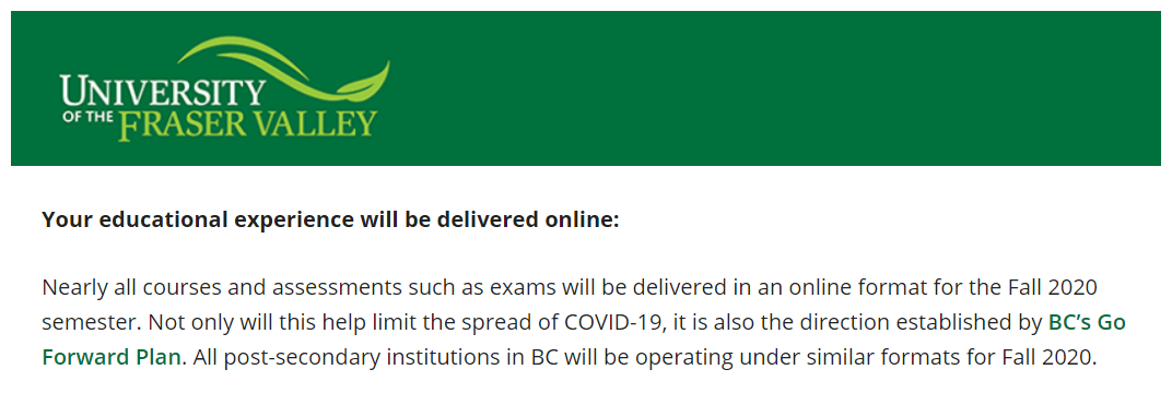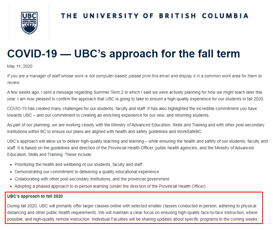 在UBC永远不会改变的两件事,即大学对学生健康和安全的重视以及UBC对提供高质量的教育的承诺,使UBC成为世界顶级大学之一,做出此决定的原因与COVID-19 疫情及其对学生健康和安全的威胁直接相关。