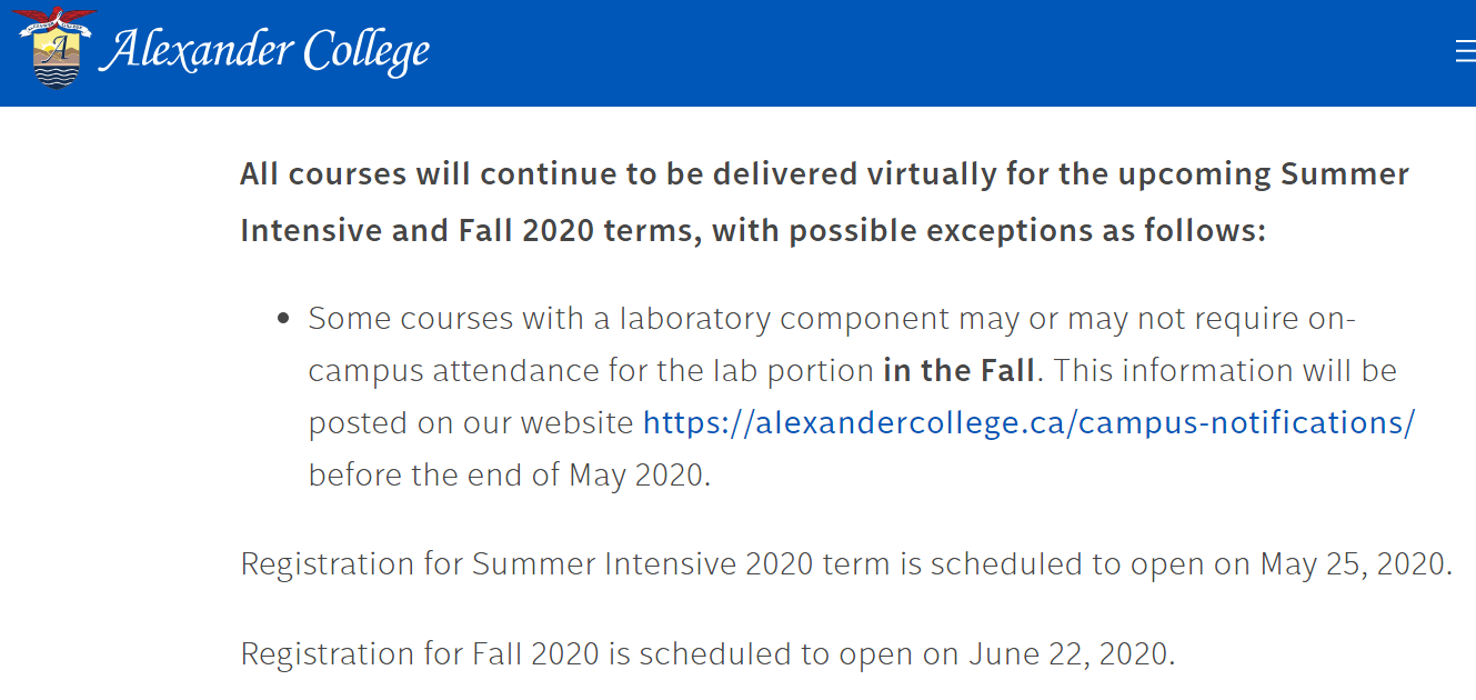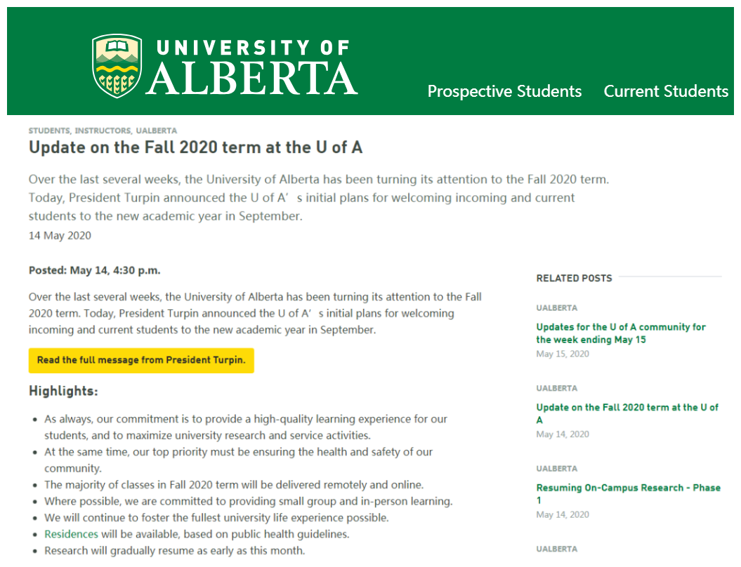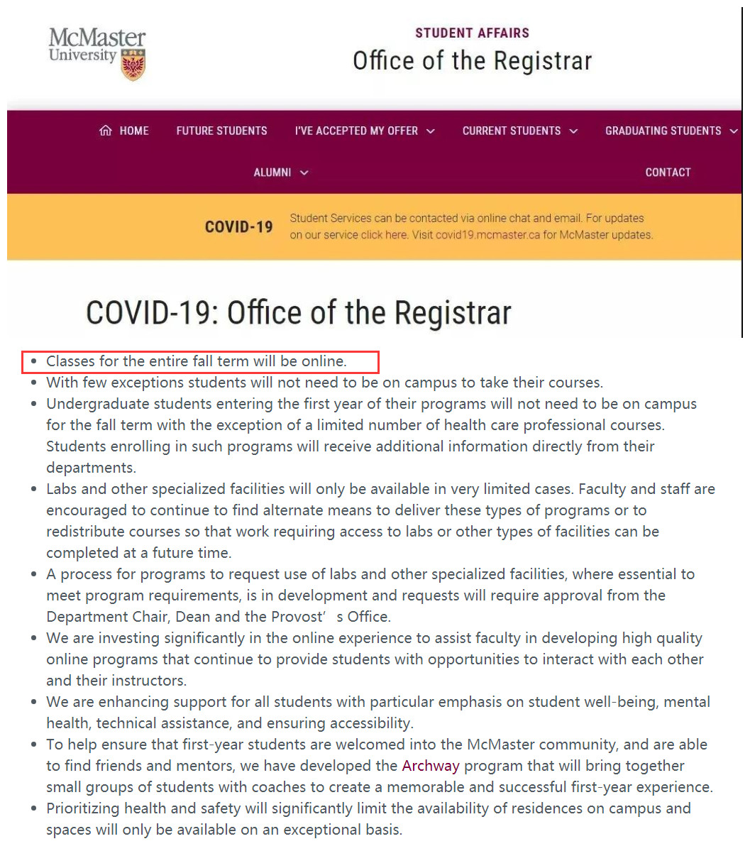 以上就是目前为止加拿大所有官宣将秋季学期改为网课的学校汇总。相信其他学校近期也会陆续出台相关的政策。不管什么上课方式,都能保证我们正常入读秋季学期。根据汇总情况来看,很多学校的规定都是“部分课程采用线上授课”或者是“混合授课”的方式来进行。是因为学校要在保证教师和学生的身体健康的前提下,尽可能为学生提供教学支持。这也体现出加拿大大学的人性化。
