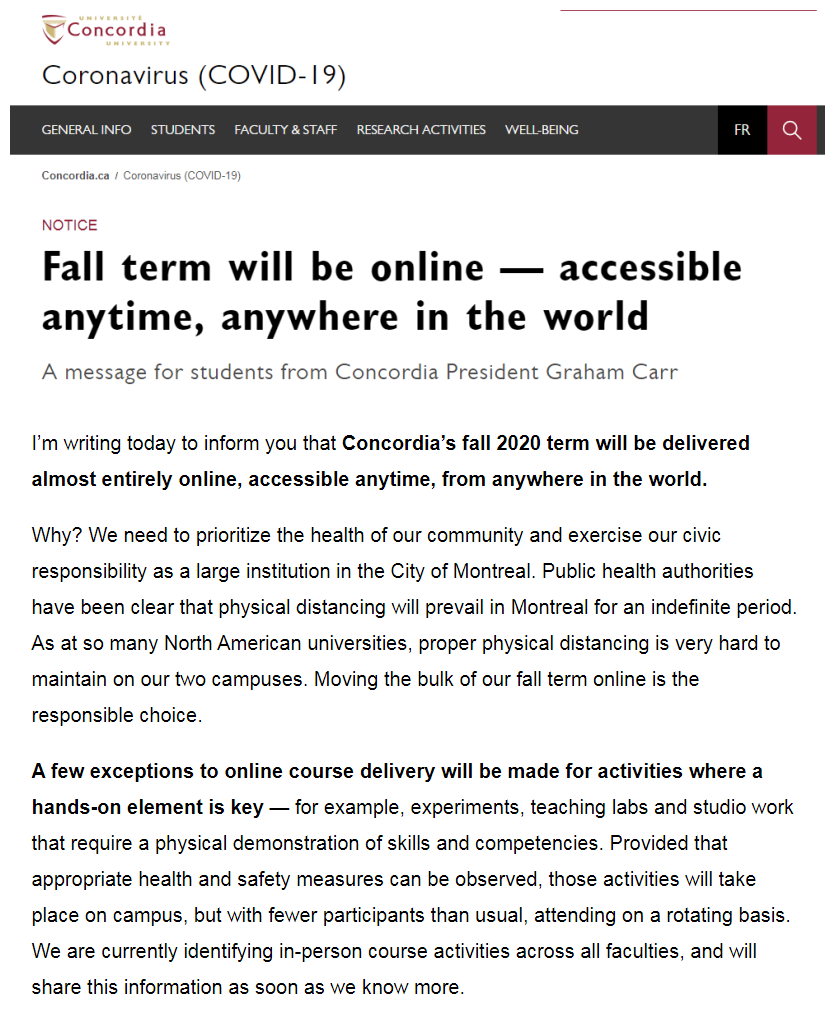 麦吉尔决定,2020年九月份无论学生在哪里,课程将主要通过远程平台进行。 对于实验和其他通常需要手工的 课程,学校给出了一系列选择,包括 virtual labs, simulations, vieo, an other tools。