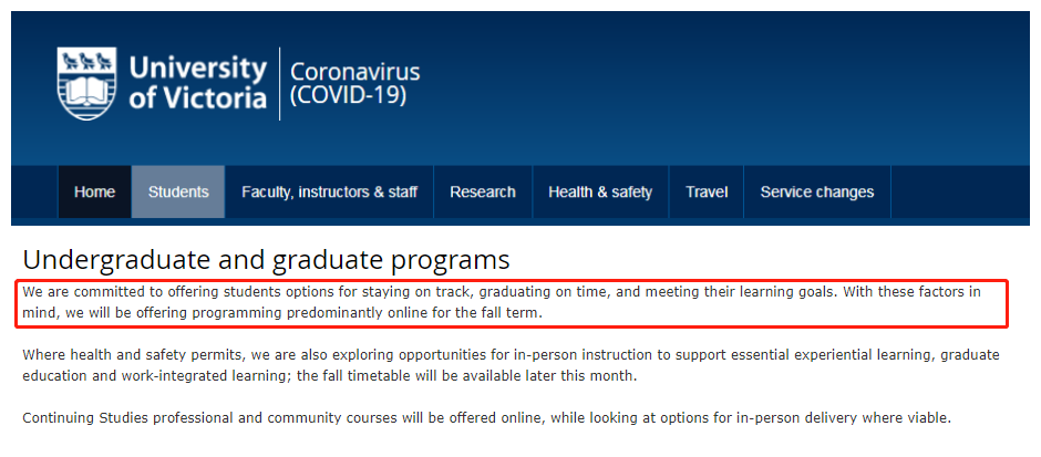 维多利亚大学2020年秋季学期将主要提供线上课程。