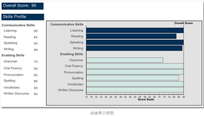 PTE考试成绩单构成:Overall Score(总成绩) + Communicative Skills(对应听说读写四个分项成绩)