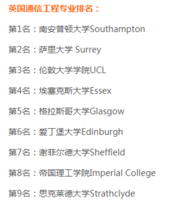 作为工业与科技强国, 英国在移动通信和网络结构方面有很强的实力 ,它的移动/无线通信,在信号处理、微波通讯、光通信等领域处于世界领先地位。作为加强UK国防水平的英国国防部防御技术中心(DTC),剑桥、卡迪夫、德蒙福特、南安普顿和萨里等都是其研究成员,一定程度上肯定了这几所学校在工程技术方面的强劲实力。