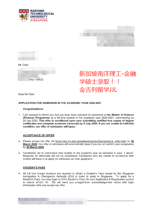 恭喜chen同学,南洋理工金融学硕士录取!!