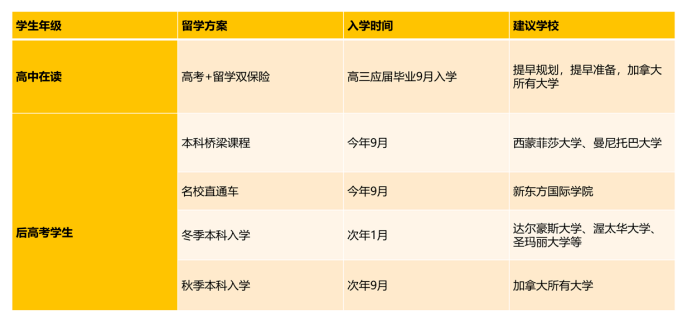 对于高考成绩能上一本线的学生,虽然这部分学生可能在中国上不了清华北大,但是可以上世界级名校像多伦多、麦吉尔、滑铁卢等顶尖名校,一般全年只有秋季入学一个时间,可以在高考后申请次年9月入学。学生可以直接用高考成绩申请大学,那么需要在暑假期间做好规划,着手准备雅思,文书,面试等。也许要等待多一年时间,但是通过一年的沉淀,可以提升自己,去到加拿大名校,等待的时间是值得的。