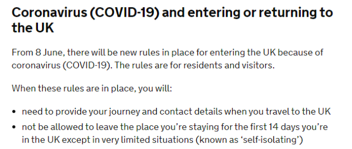 据英国文化教育协会报道,根据英国政府规定,从2020年6月8日起, 所有英国入境的旅客(包括英国公民及外籍访客)都需要自入境日期开始,进行为期14天的自我隔离。