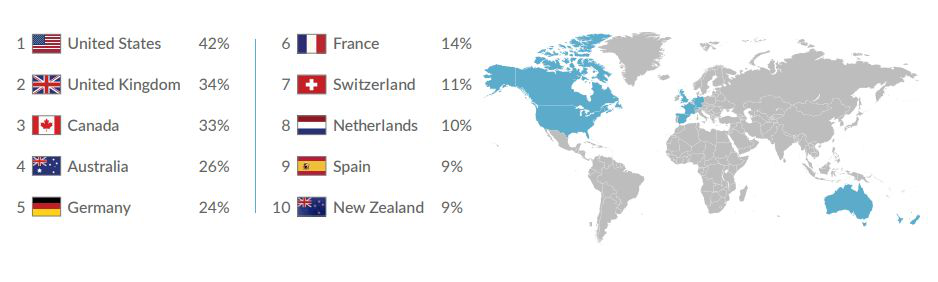 最受欢迎的留学国家前五名分别是: 美国 (48%)、英国(42%)、加拿大 (34%)、澳洲 (28%) 、德国(28%)。