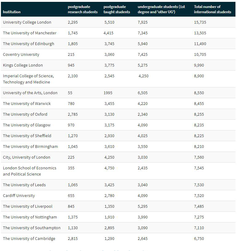 下图是 2016-2017招收国际生最多的20个英国大学,前三名分别被 UCL、曼大 和 爱丁堡 包揽。