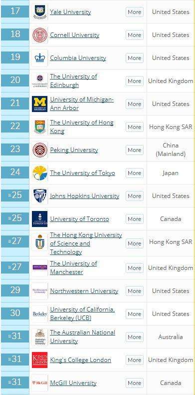 中国的大学带来了惊喜,今年总共有41所中国大陆地区的大学参与排名,有9所大学是首次上榜。排名第一的是清华大学,由去年世界第16名上升到第15名,打破了中国大学最高排位。中国高等教育近年来不断提高的喜人表现,也值得世界的关注。