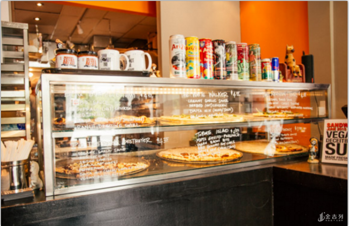 一个有着&lquo;薄底&rquo;和&lquo;素食&rquo;加持的披萨店,它就不再仅仅是一个披萨店那么简单了。 A piecalypse Now!的披萨有vegan和vegetarian的选项,严格的vegan可以选择Pepperphony,仿肉的pepperoni,非动物乳制芝士和多伦多当地产的西红柿制成的番茄酱,三种原料经典组合的完全无肉无蛋奶披萨,但口味却和普通披萨的味道相差无几。