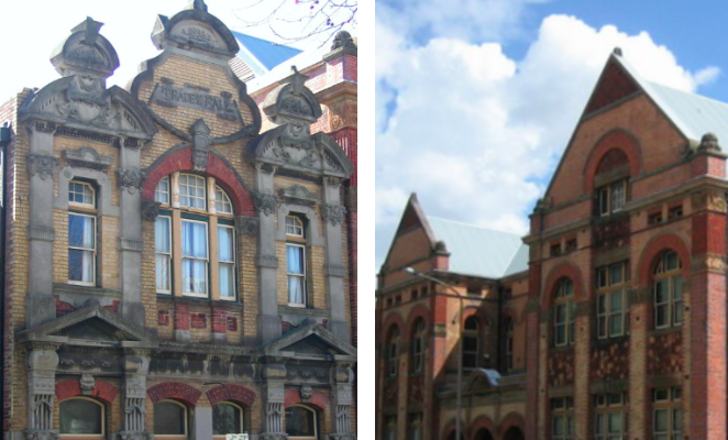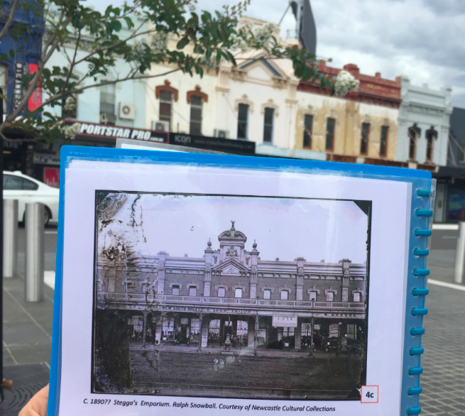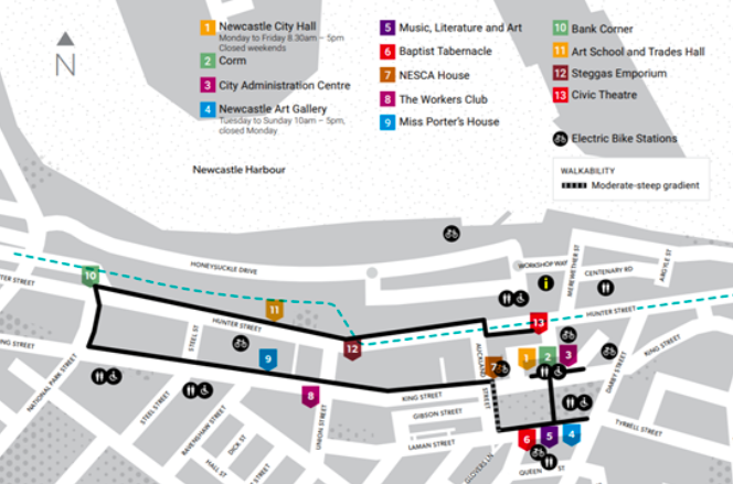 商业贸易大厅和纽卡斯尔技术学校是猎人街头最具两点的两个建筑。 1895年建造的贸易大厅是一个两层结构的巴洛克复兴(联邦盎格鲁-荷兰风格),带着华丽的立面具有双压的米黄色和红色砖块。纽卡斯尔技术学校是 维多利亚晚期的新古典主义罗马式风格。 装饰立面采用彩砖和彩石,采用 右边比左边大 不对称的构图。