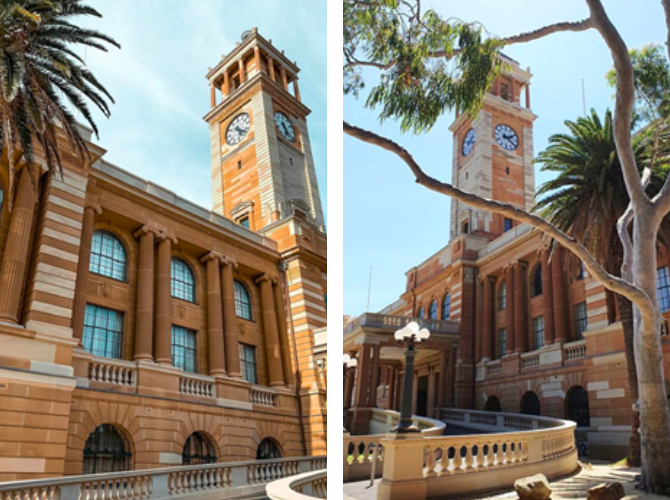 市政厅以其金色的悉尼砂岩立面、直径3米的高大时钟、宏伟的罗马多利克柱和爱奥尼亚柱而闻名。 这栋三层的国家遗产建筑由著名建筑师亨利·埃里·怀特 (Henry Eli White) 设计,于1929年竣工,如今是战争时期古典学术风格的代表典范。