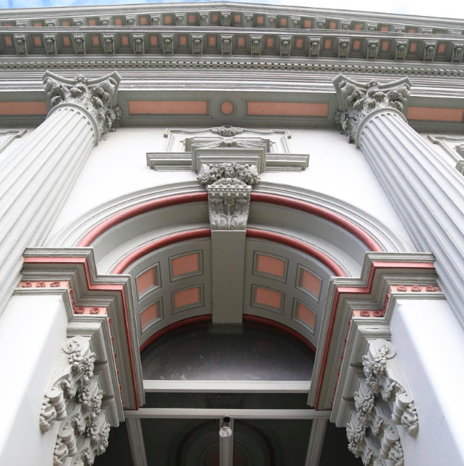两层的砖砌立面, 优雅的双层半圆头窗户 具有意大利文艺复兴的元素,而室内的 装饰穹顶的天花板、大理石楼梯、水磨石阳台和枝形吊灯等 设计又极具西班牙巴洛克风格。