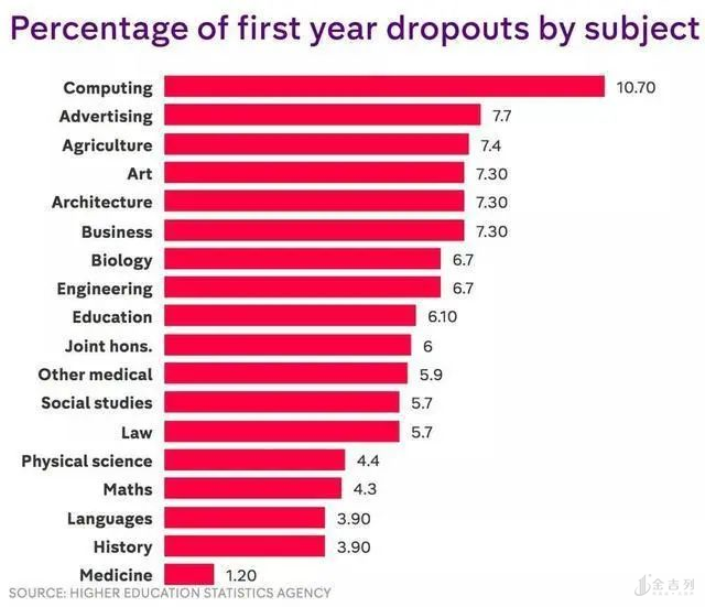 另外,HESA不仅统计了英国大学的通过率,还统计了各专业学科的辍学率。