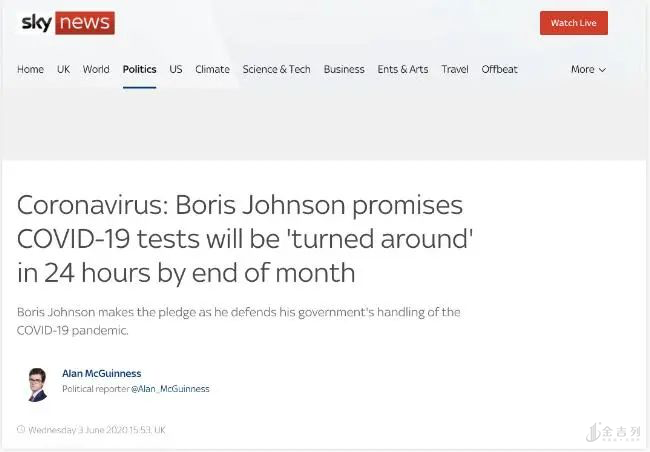 英国首相鲍里斯今天宣布,英国政府将在6月底前,达成所有新冠核酸测试(需要邮寄的测试除外)在24小时之内就出结果的新目标。
