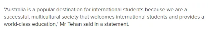 但对于这个情况,澳洲教育部长Dan Tehan出面进行了否认。他表示:“澳洲是国际学生的热门选择,因为澳洲是一个成功的多元文化社会,欢迎留学生并给他们提供一流的教育。”