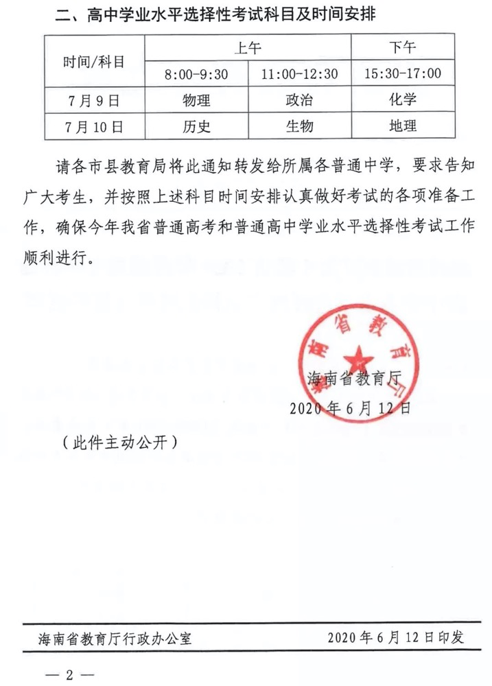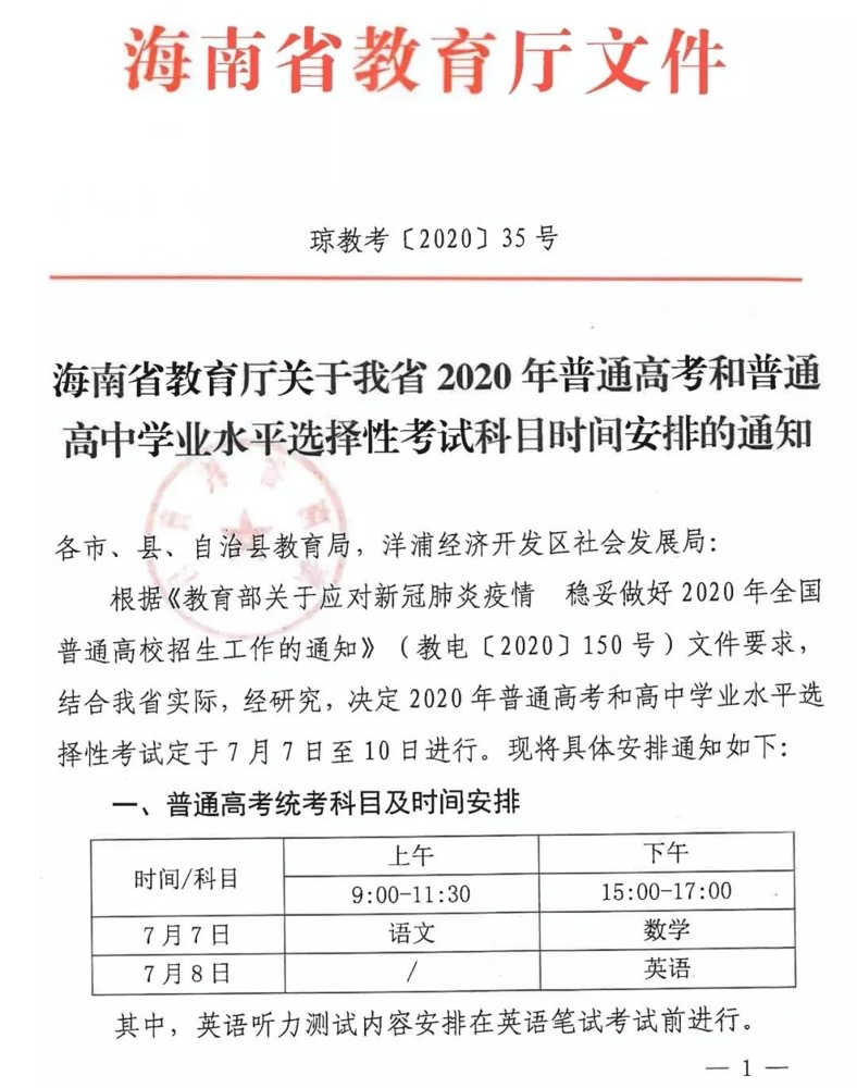 根据海南省教育厅发布的《关于我省2020年普通高考和普通高中学业水平选择性考试科目时间安排的通知》,2020年我省普通高考和高中学业水平选择性考试定于7月7日至10日进行。