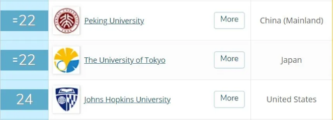 我们以最新的QS大学排名为例,北京大学和东京大学均位于第22位,排在第24位的是美国名校约翰霍普金斯大学,让我们对这三所学校的入学难度、学费、生活费方面做一个简单的对比。