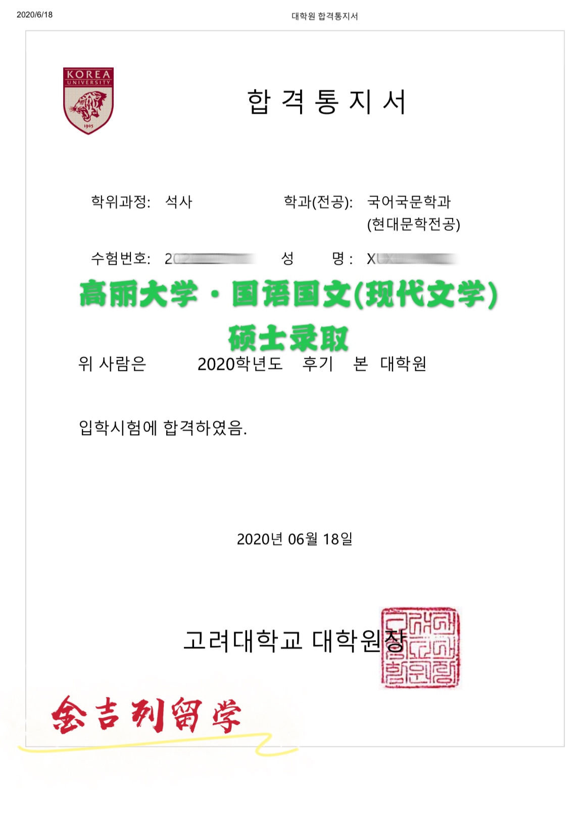 恭喜金吉列留学的徐同学顺利获得高丽大学国语国文(现代文学)硕士录取!