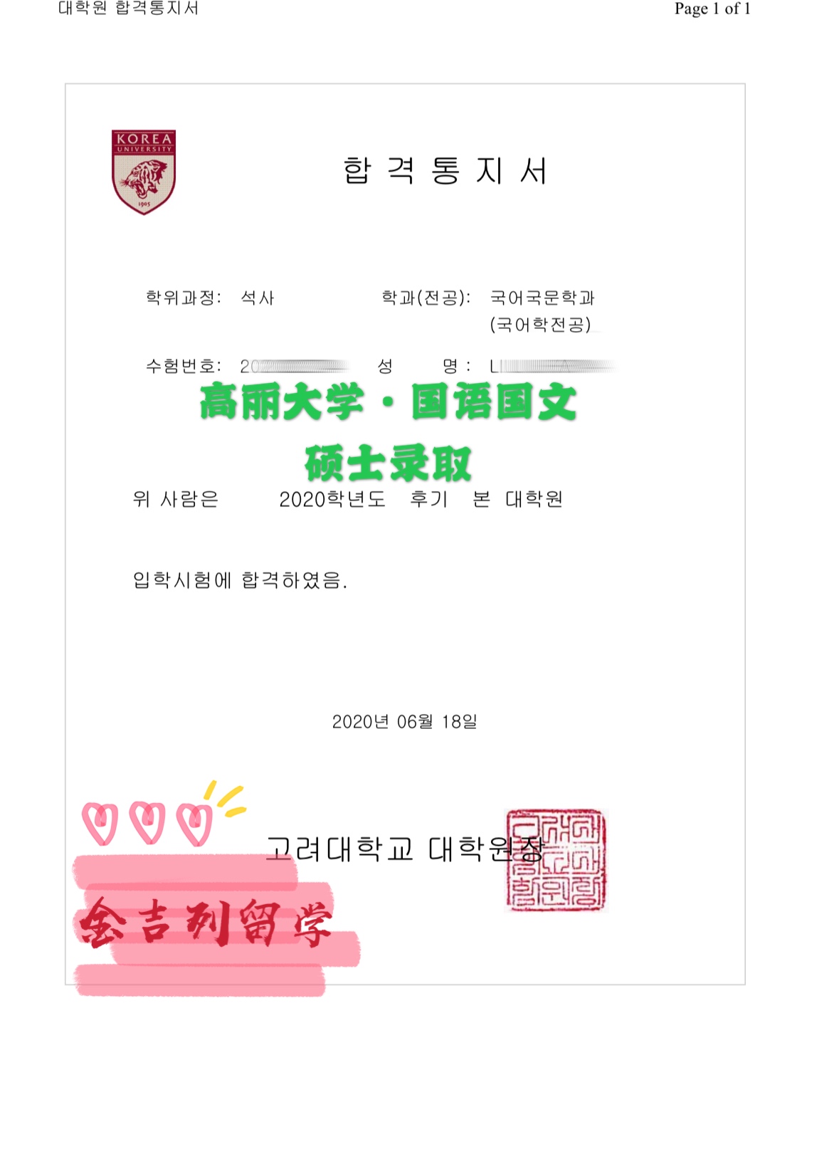 恭喜金吉列留学的刘同学顺利获得高丽大学国语国文(国语学)硕士录取!