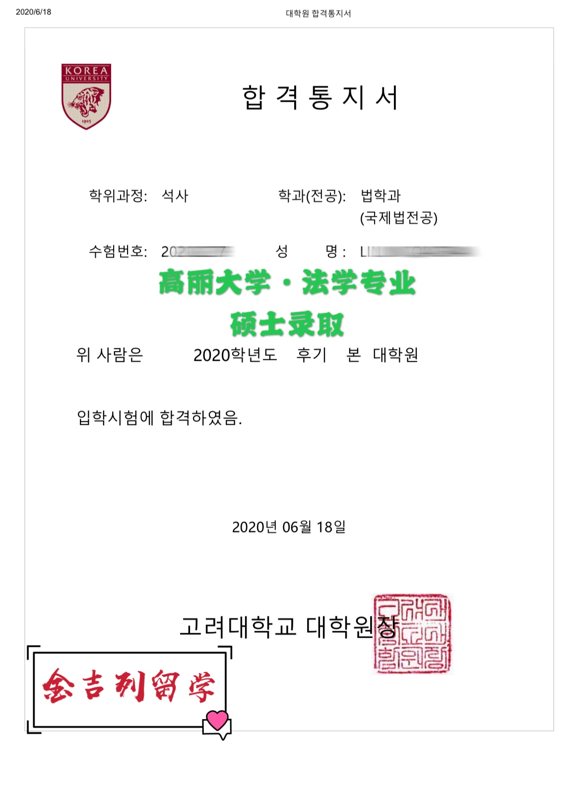 恭喜金吉列留学的林同学顺利获得高丽大学法学专业硕士录取!