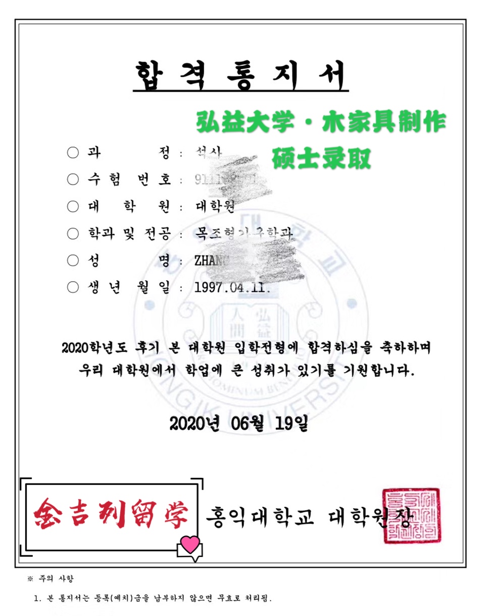 恭喜金吉列留学的张同学顺利获得弘益大学木家具制作专业硕士录取!