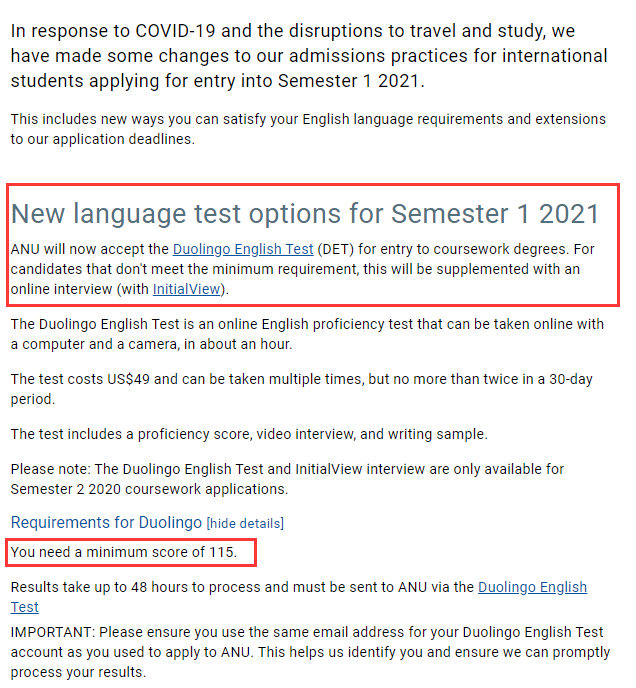 澳国立大学将延长接受Duolingo考试成绩的申请至2021 S1,最低分数要求为115分。