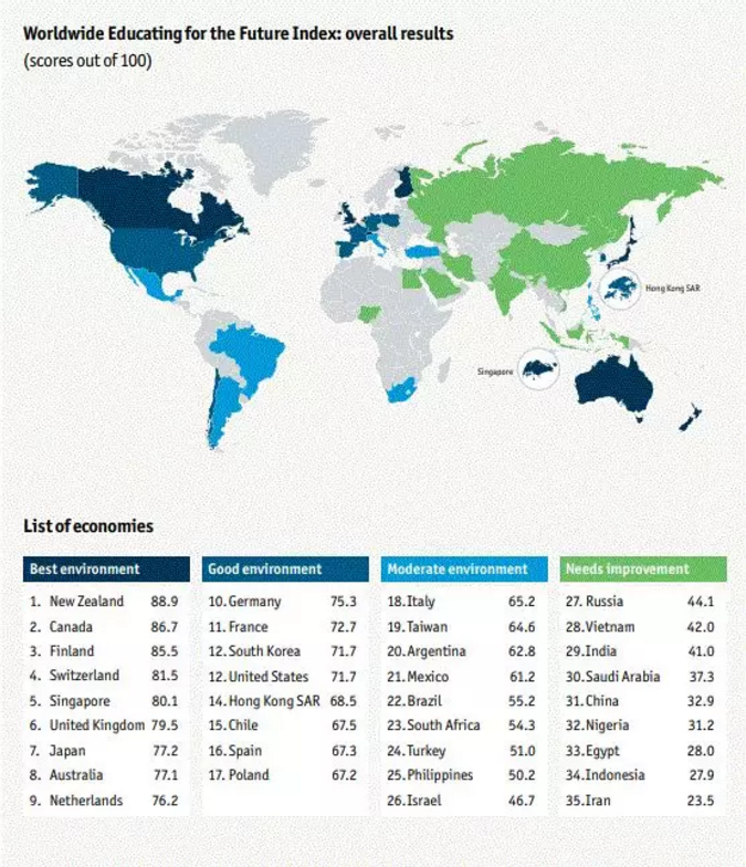 在2017年,由全球最大的教育单项奖“一丹奖”基金会创建,经济学人智库(The Economist Intelligence Unit,简称EIU)编制的《全球教育未来指数》报告首次以评估教育体系的效能,帮助学生在飞速变化的环境中更好地应对工作和生活为目的,从多个维度评估经济体的表现。