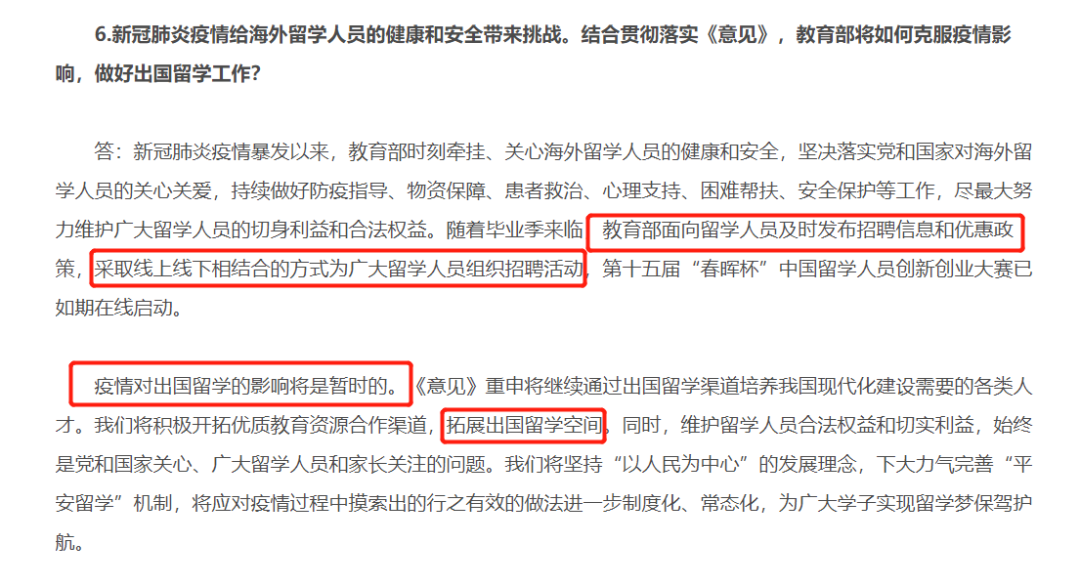 除此之外,教育部也在时刻牵挂、关心着海外留学人员的健康和安全!“会尽最大努力维护广大留学人员的切身利益和合法权益。下大力气完善“平安留学”机制,为广大学子实现留学梦保驾护航。”