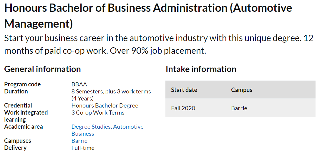就业方向:汽车制造企业,如保时捷加拿大、本田、福特、大众等;汽车零售经销企业,如Pfaff, Humber View, Open Roas, New Roas等;汽车售后市场,包括零配件制造和经销企业,售后服务中心等,如Magna, Tenneco, Active Green, Ross等;金融领域,包括专业汽车金融公司以及各银行的汽车金融部门,如TD Auto Finance等;汽车拍卖、租赁、技术营销公司,如SCI Maketview, Aesa Auctions等。