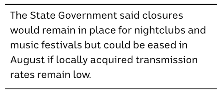 但如果到时新州的疫情控制比较成功,病毒本地传播率能保持在低水平的话,新州政府则会考虑在8月时放宽对夜店和音乐节的限制。