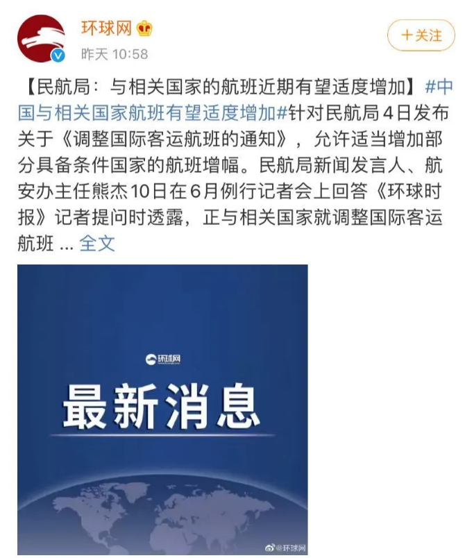 中国民航局新闻发言人,航安办主任熊杰在6月例行记者会上透露,正与相关国家就调整国际客运航班事宜进行沟通,从工作进展情况看,与相关国家的航班近期有望适度增加。