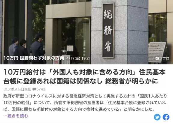 ①4月18日,发放全民10万日元(约6,574元人民币)补助金。