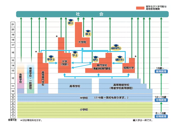 进入日本的大学(本科)、短期大学、专门学校学习,原则上必须修完正式学校教育12年的课程。如果插班进入高等专门学校,则必须修完11年,如果进入研究生院(硕士课程)则必须修完16年学校教育的课程。