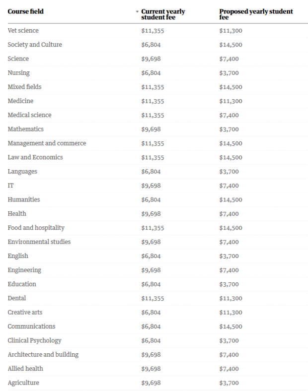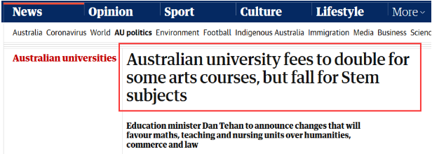 联邦政府声称,今后就读艺术专业的学生,将面临学费双倍增长,同时,商科和法律学费也将上涨,以此为扩大39,000个招生名额提供资金支持,同时也为学习教学、护理、数学、科学和工程等热门课程的学生提供更为低廉的学费。
