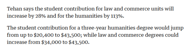 虽然从列表上看,一些例如Humanities的学科学费增长惊人,但是Tehan提及,这次的增长不是基于"egree"的基础上,而是基于“unit”的基础上.