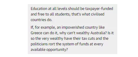 也有人认为,澳洲公立大学的学费原本就远远高于其他国家,有时甚至达到美国公立大学的2倍。而本科教育在一些欧洲国家甚至是免费的,一些人建议澳洲大学教育应该由纳税人资助,面对学生免费,这才是一个文明国家的作法。