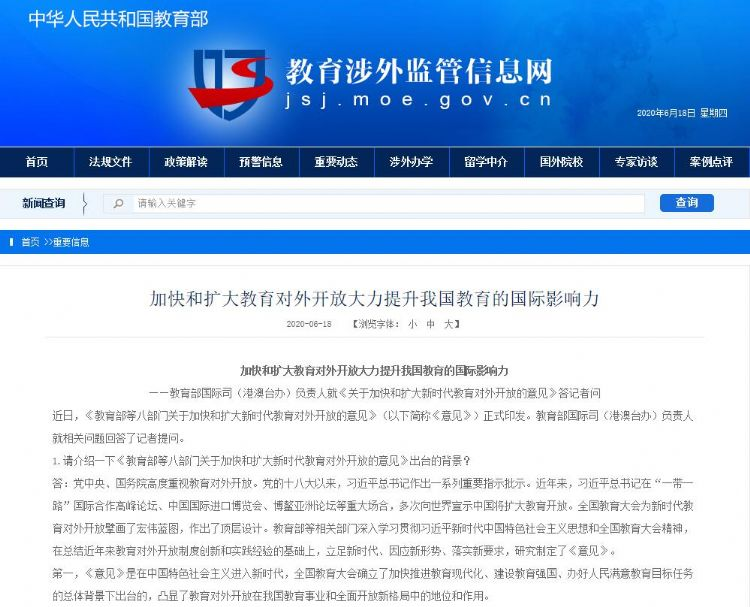 近日,《教育部等八部门关于加快和扩大新时代教育对外开放的意见》(以下简称《意见》)正式印发。教育部国际司(港澳台办)负责人就相关问题回答了记者提问。