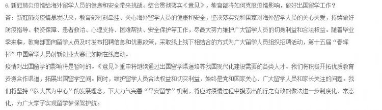 答:新冠肺炎疫情暴发以来,教育部时刻牵挂、关心海外留学人员的健康和安全,坚决落实党和国家对海外留学人员的关心关爱,持续做好防疫指导、物资保障、患者救治、心理支持、困难帮扶、安全保护等工作,尽最大努力维护广大留学人员的切身利益和合法权益。随着毕业季来临,教育部面向留学人员及时发布招聘信息和优惠政策,采取线上线下相结合的方式为广大留学人员组织招聘活动,第十五届“春晖杯”中国留学人员创新创业大赛已如期在线启动。
