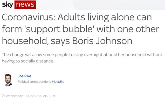 英国首相鲍里斯·约翰逊(Boris Johnson)宣布,从周六起,英格兰的单个的成年人,可以在别人的房子里过夜,前提是形成了“互助泡泡”。